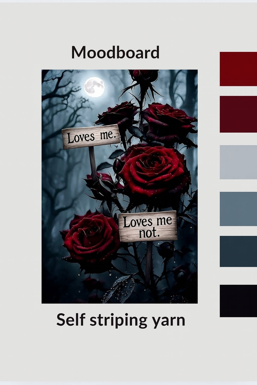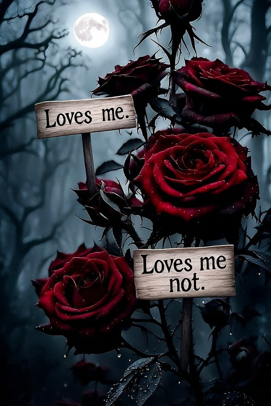 A gothic, moonlit forest sets the stage, with blood-red roses glistening in the foreground. Suspended among their thorny stems are two weathered wooden signs: one reads "Loves me.", the other "Loves me not." The contrast between the vivid blooms and the eerie backdrop evokes a haunting, romantic tension.