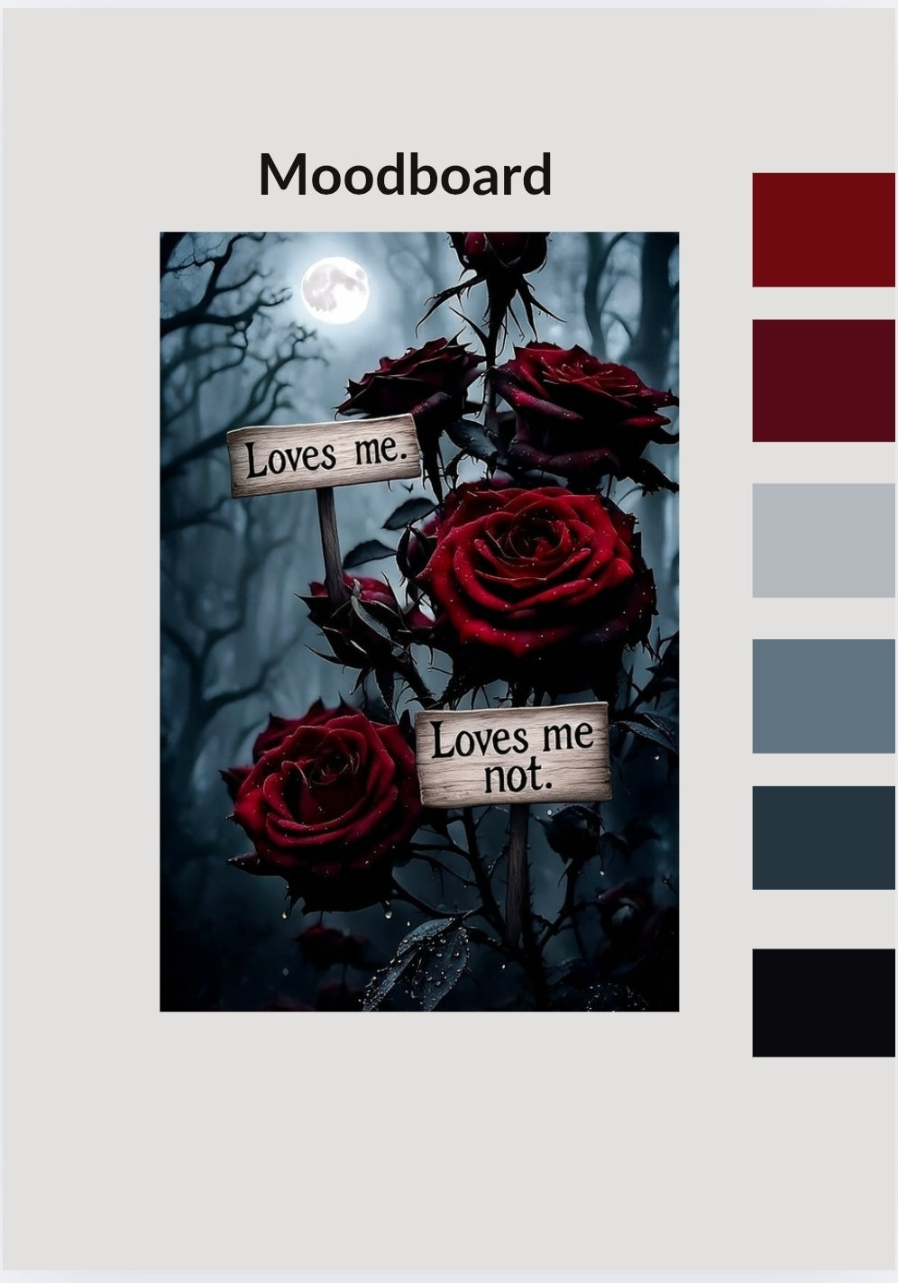 A gothic, moonlit forest sets the stage, with blood-red roses glistening in the foreground. Suspended among their thorny stems are two weathered wooden signs: one reads "Loves me.", the other "Loves me not." The contrast between the vivid blooms and the eerie backdrop evokes a haunting, romantic tension.