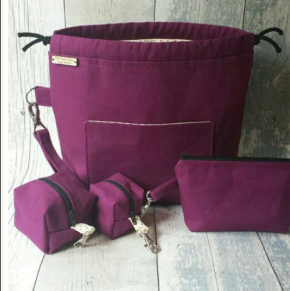 Medium 12 × 10 inch Canvas drawstring project bag with front pocket, coordinated notions pouch and 2 square pouches.